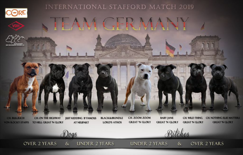 „Wir sind sehr stolz, dass 5 unserer Hunde als „deutsche Nationalmannschaft“ nach Holland reisen dürfen um gegen die Teams anderer Länder auf dem „Internationalen Stafford Match“ anzutreten und somit Deutschland zu vertreten.“