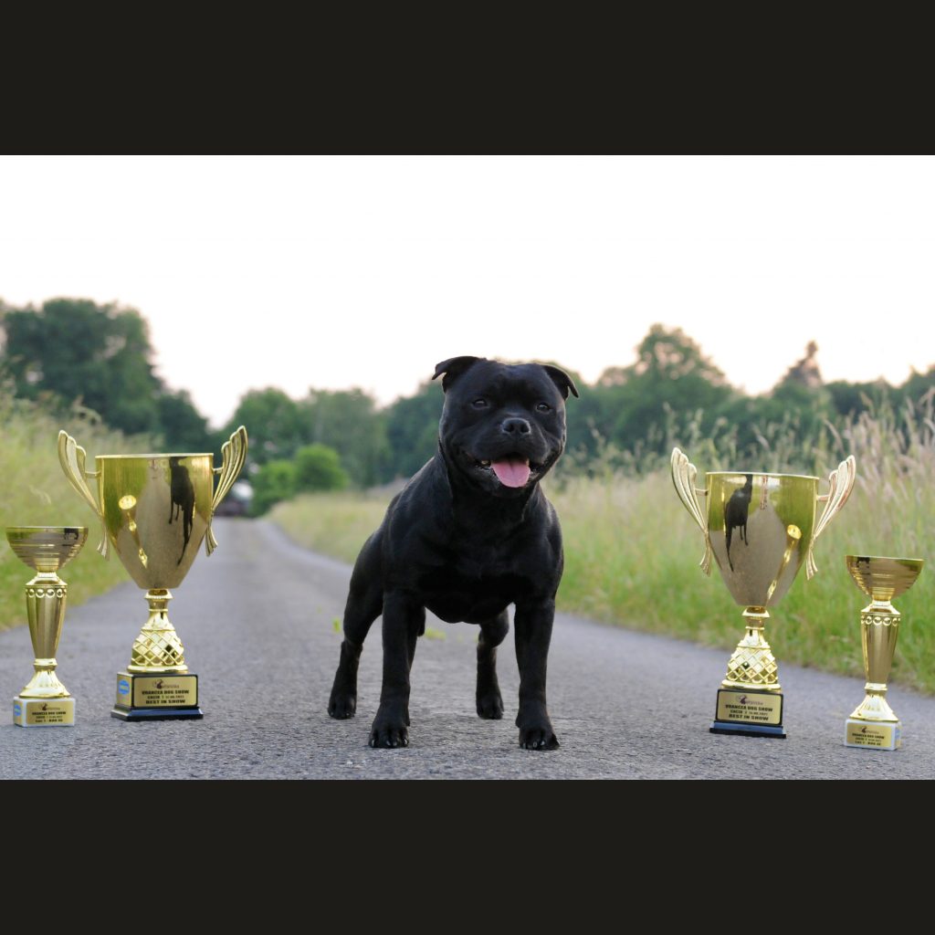 hat das „Best in Show“ der internationalen Hundeausstellung CACIB Vrancea gewonnen. An beiden Show Tagen wurde er der beste Hund der kompletten Ausstellung. Erst wurde er der beste Hund der Rasse Staffordshire Bull Terrier, dann konnte er die Terrier Gruppe gewinnen (bester Terrier der Show) und er konnte danach sogar noch das „Best in Show“ gewinnen und so bester Hund aller Rassen bzw. der gesamten Ausstellung werden.